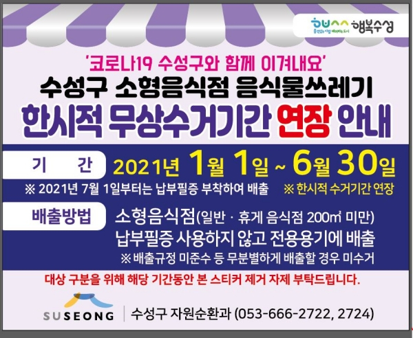 소형음식점 음식물쓰레기 무상수거는 수성구에 소재한 200㎡ 미만 일반음식점과 휴게음식점 5천여 개소가 대상이다. 무상수거기간 중에서는 음식물쓰레기 납부필증을 부착하지 않고 전용 수거용기에 배출하면 구청에서 수거하게 된다.