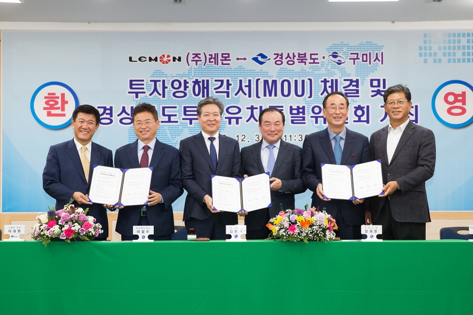 경상북도와 구미시는 3일 오전 11시 30분 구미시청 3층 상황실에서 ㈜레몬과 *나노 멤브레인 제조시설 건립을 위한 투자양해각서(MOU)를 체결했다.