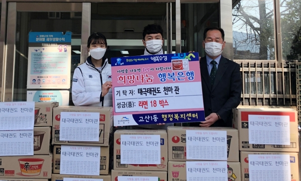 태극태권도 천마관(관장 권기범)은 지난 4일 관원들과 함께 저소득층이 따뜻한 겨울을 보낼 수 있도록 라면 18박스를 고산1동행정복지센터에 전달했다.
