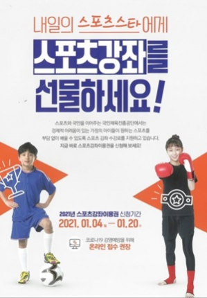 스포츠강좌이용권은 경제적 어려움이 있는 가정의 유‧청소년들에게 체육활동 참여기회를 제공하여 체력향상과 건강증진에 도움을 주는 사업으로 대상자에게 매월 8만원 범위 내에서 연간 8개월 이내(2021년 2월부터 지원) 태권도, 검도 등 다양한 스포츠강좌 수강료를 지원한다.