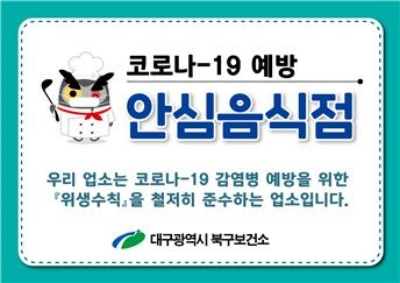 대구 북구보건소는 식사문화 개선 과제 및 생활방역 수칙을 준수하는 음식점을 확산하기 위하여 안심음식점을 지속적으로 모집한다.