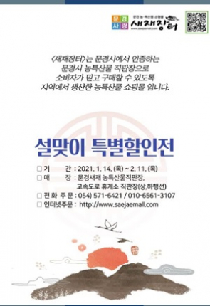 문경시는 신축년 새해 설 명절을 앞두고 코로나로 인해 어려운 농가를 돕고 문경시 농·특산물의 홍보와 판매를 위해 온라인쇼핑몰『문경사랑 새재장터』와 새재직판장 등 에서 농·특산물 설 명절 할인 판매를 실시할 계획이다.