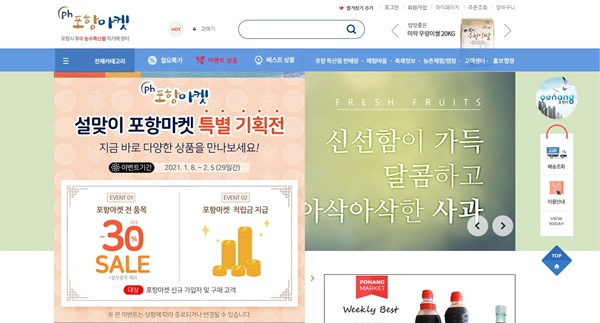 포항시는 1월 8일부터 2월 5일까지 29일간 포항시 농특산물 온라인 쇼핑몰 ‘포항마켓(www.pohangmarket.com)’에서 설을 맞이하여 최대 30% 할인 특가 이벤트를 실시한다.