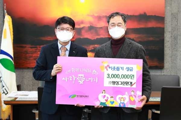 ㈜명성그린환경(대표 김영규)은 1월 15일(금) 북구 저소득층을 위하여 성금 300만 원을 북구청(구청장 배광식)에 전달했다.