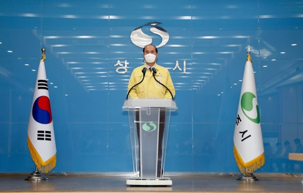 강영석 시장은 이날 오전 상주시청 대회의실에서 담화문을 발표하고 BTJ열방센터의 코로나19 확진자 집단 발생에 따른 대응과 경제 살리기 대책을 설명했다.