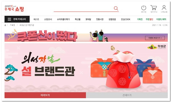 해당 프로모션은 우체국쇼핑몰에 접속, 카테고리의 기획전-지역브랜드관-의성장날 설 브랜드관을 통해 확인할 수 있다.