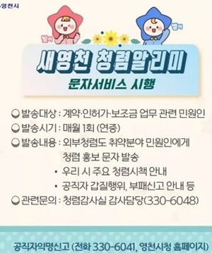 올해 새롭게 시행되는 「새영천 청렴알리미」는 매월 계약·인허가·보조금 관련 민원인을 대상으로 시의 주요 청렴시책과 공직자 관련 부패신고, 갑질 행위 신고 안내 등의 문자메시지를 전송하는 제도이다.