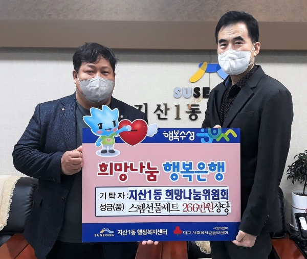 | 대구 수성구 지산1동 희망나눔위원회(위원장 서신교)는 지난 22일 지산1동행정복지센터를 방문해 어려운 이웃들에게 전달해 달라며 스팸선물세트(266만 원 상당)를 전달했다.
