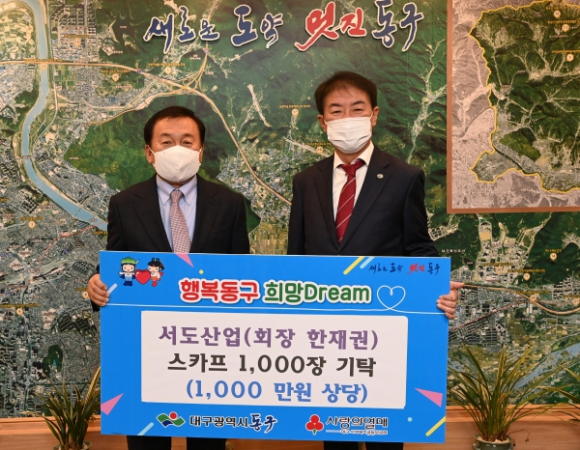 서도산업(주)(회장 한재권)은 26일 동구청을 방문하여 코로나19로 고생하고 있는 저소득 독거노인을 위해 써 달라며 스카프 1천 장(1천만 원 상당)을 기탁하였다.