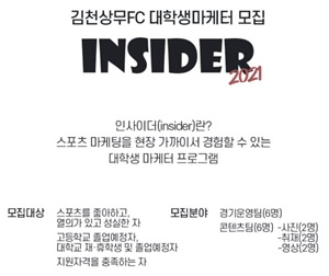 김천상무프로축구단(대표이사 배낙호)이 대학생마케터 ‘인사이더’ 1기를 모집한다. 인사이더(Insider)는 스포츠 마케팅을 현장 가까이서 경험하고자 하는 대학생 마케터 프로그램으로 2021년 1기를 운영한다.