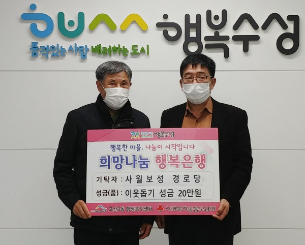 대구 수성구 고산3동 사월보성 경로당(회장 박정복)은 지난 26일 고산3동행정복지센터를 방문해 저소득 이웃을 위해 써달라며 회원들이 십시일반 모은 성금 20만 원을 전달했다.