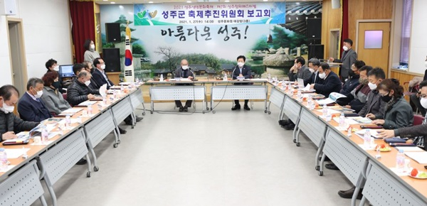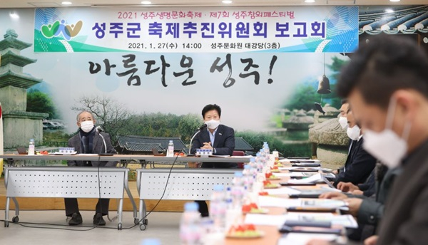 성주군축제추진위원회(위원장 이창길)는「2021 성주생명문화축제․제7회 성주참외페스티벌」추진을 위한 성주군축제추진위원회 준비 보고회를 1월 27일 성주문화원 대강당에서 개최했다. 이날 회의는 이창길 축제추진위원장 주재로 이병환 성주군수를 비롯하여 축제추진위원, 축제 대행사 등이 참석하여 축제 추진계획 보고와 토의를 통해 성공적인 개최를 위한 첫 발을 내딛었다.