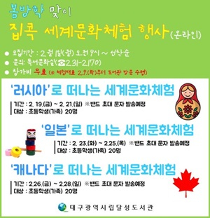 대구달성도서관(관장 김화숙)은 2월 1일(월) 오전 9시부터 달성도서관 홈페이지(https://library.daegu.go.kr/dalseong)를 통해 <집콕! 세계문화체험 행사>에 참여할 초등학생 가족 선착순 60팀을 모집한다.