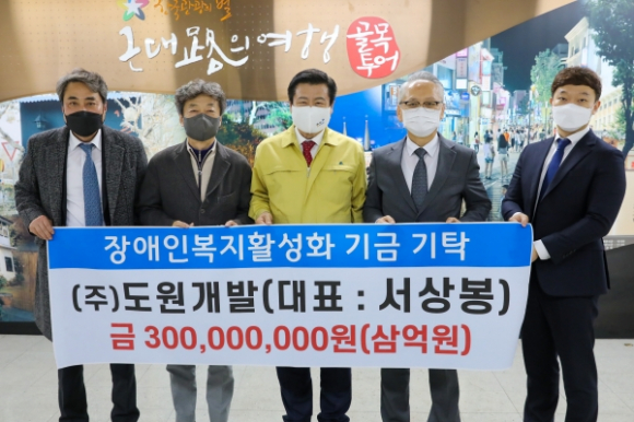 ㈜도원개발(대표 서상봉)은 1월 27일 중구청을 방문해 중구 장애인복지사업활성화를 위한 후원금 3억 원을 기탁했다.