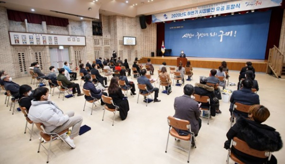구미시(시장 장세용)는 1. 28.(목) ~ 1. 29.(금) 구미시청 4층 대강당에서 지난해 연말 코로나19 상황 악화로 연기되었던「2020년 하반기 시정발전 유공 정기표창식」을 개최하였다.