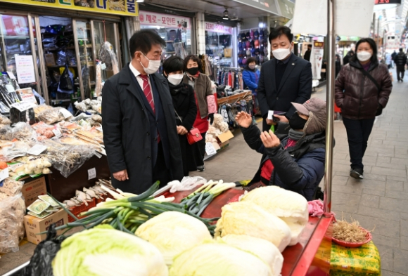 | ↑↑ 배기철 동구청장은 설 명절을 맞아 동서시장을 방문해 상인들을 격려하고 있다. |