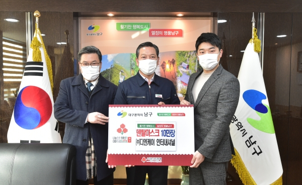 대구광역시 남구청(구청장 조재구)은 지난 3일, ㈜디엔케이 인터내셔널(대표 김경석)에서 어려운 이웃을 위해 국내산 덴탈마스크 10만장(2,000만원 상당)을 전달했다고 밝혔다.