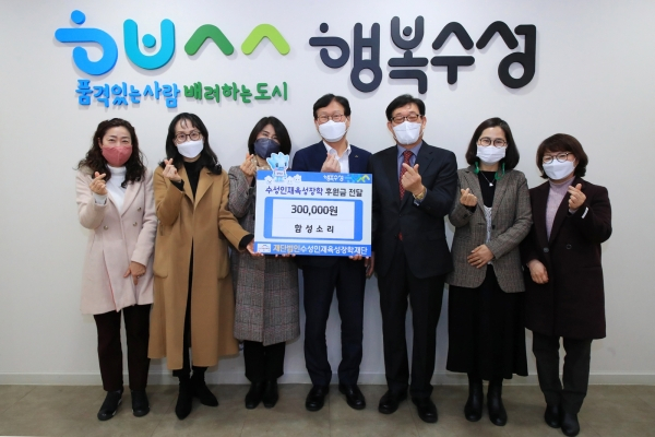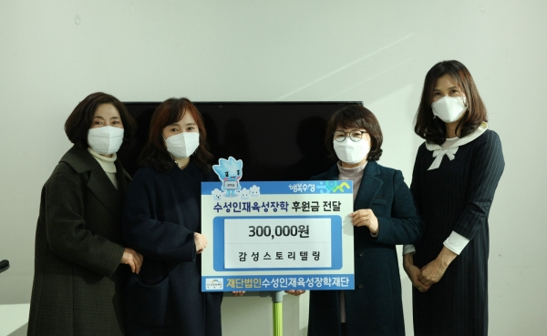 수성글로벌ESD연대 100만 원, 함성소리 30만 원, 감성스토리텔링이 30만 원의 장학금을 수성인재육성장학재단에 쾌척했다.