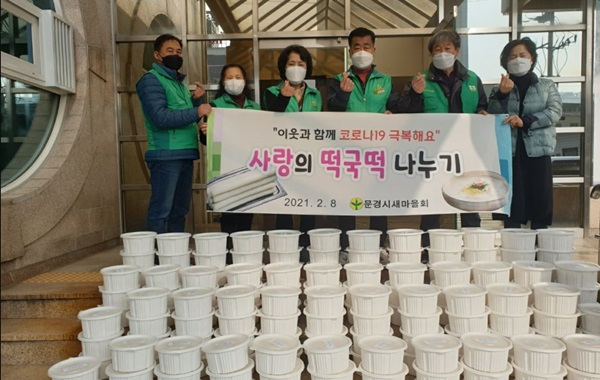 문경시새마을회(회장 박원규)는 2월 8일 문경시새마을회 사무실 전정에서 다가오는 민족 최대명절인 설을 맞아 친환경쌀로 만든 떡국떡(240㎏, 100만원 상당)을 관내 저소득 독거노인 및 취약계층 200여 가구에 전달하는‘사랑의 떡국떡 나눔’행사를 가졌다.