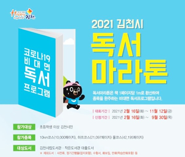 김천시(시장 김충섭)에서는 함께 읽고 성장하는 명품도시 김천의 해피투게더운동 확산을 위해 2월 16일부터 11월 12일까지 「독서마라톤 대회」를 개최한다.