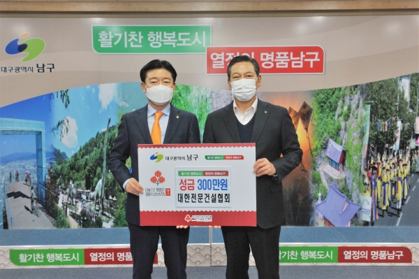 조재구 남구청장은 “어려운 시기에도 잊지 않고 매년 따뜻한 마음을 전해주시는 대한전문건설협회 대구시회에 감사드린다”며 고마움을 전했다.