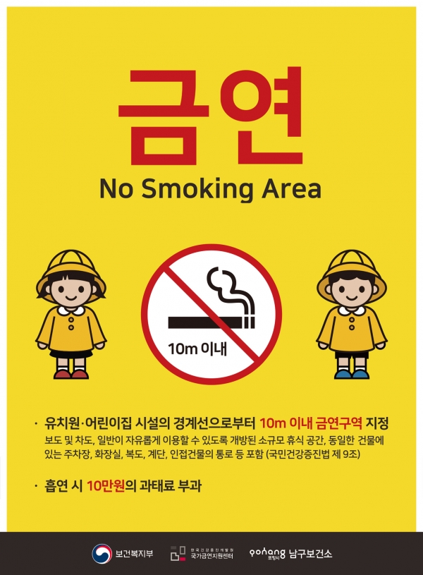 남북구보건소는 국민건강증진법의 시행규칙 개정안이 오는 12월 31일부터 시행되어 유치원과 어린이집 경계선 10M 이내에서 흡연할 수 없다고 밝혔다.