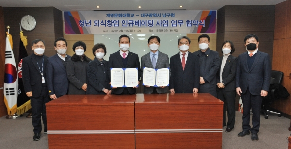 | ↑↑ 2월 16일 11시 30분 계명문화대학교 문화관 대회의실에서 대구 남구청과 계명문화대학교가 청년 외식창업 인큐베이팅 업무협약(MOU)을 체결하고 기념촬영을 하고 있다. |