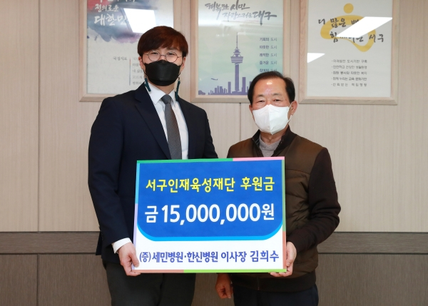 세민병원·한신병원(이사장 김희수)은 19일 지역 인재육성을 위해 (재)서구인재육성재단(이사장 류한국)에 후원금 15백만 원을 전달하였다.
