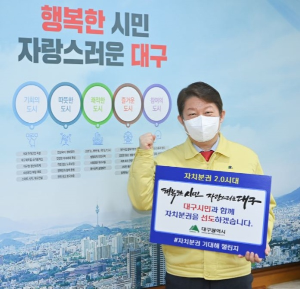 권영진 대구시장은 2월 26일(금) 주민 중심의 실질적인 자치분권 실현에 대한 적극적인 관심을 갖고 ‘자치분권 기대해’ 챌린지에 동참했다.