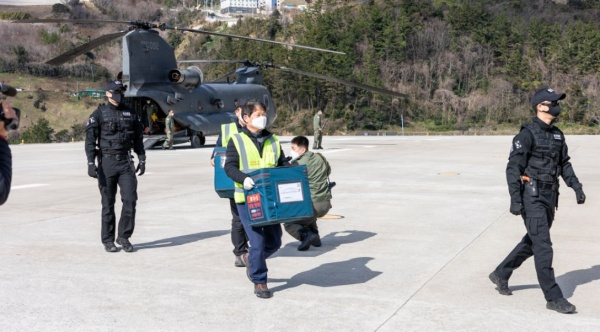 울릉군은 지난 2월 28일 오전 11시에 코로나19 백신 200인분이 헬기를 통해 해군 118전대를 거쳐 울릉군 보건의료원으로 수송이 완료되었다고 밝혔다.