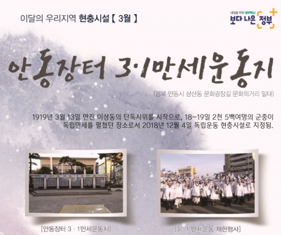 경북북부보훈지청(지청장 우진수)은 2021년 3월 이달의 우리지역 현충시설로 안동장터 3·1만세운동지(경북 안동시 삼산동 문화광장길 문화의거리 일대)를 선정했다고 밝혔다.