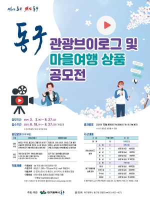 공모기간은 3월 2일부터 8월 27일까지이고, 접수기간은 8월 18일부터 8월 27일까지이며, 시상내용은 분야별 대상 2편 등 총 수상작 10편, 상금은 1,000만 원 규모로 상금과 함께 포상(동구청장상)이 주어진다.