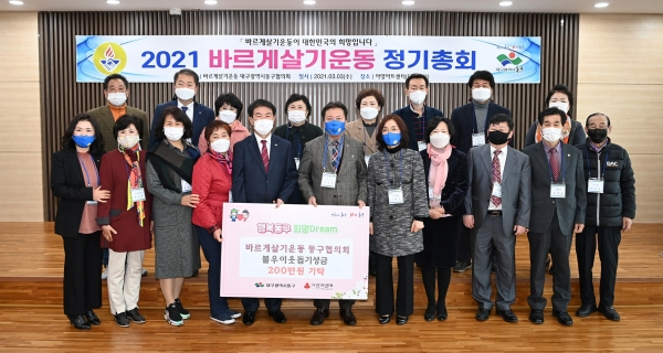 바르게살기운동 대구동구협의회(회장 박동선)는 지난 3일 아양아트센터에서 열린 2021년 바르게살기운동 동구협의회 정기총회에서 동구청에 불우이웃돕기 성금 200만 원을 전달했다.