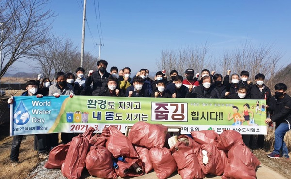 문경시는 세계 물의 날을 맞아 3월 5일 영순면 달지 상수원보호구역 일원에서 ‘줍깅’환경정화활동을 실시했다.‘줍깅’은 ‘쓰레기 줍기’와 ‘조깅’을 합성한 신조어로 조깅을 하면서 쓰레기를 줍는 친환경 캠페인이다.