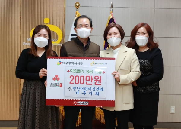 대구 서구(구청장 류한국)의 민간어린이집연합회는 서구청을 방문하여 코로나19로 어렵고 소외된 이웃들에게 전달해 달라며 성금 200만 원을 기탁했다.