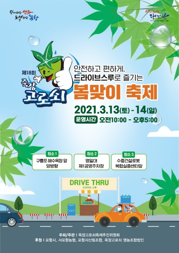 포항시는 오는 13일부터 14일까지(오전 10시 ~ 오후 5시) 구룡포해수욕장 등 주요 관광지 도로변 3개소에서 드라이브스루 방식으로 ‘제18회 죽장고로쇠 봄맞이 축제’를 개최한다.