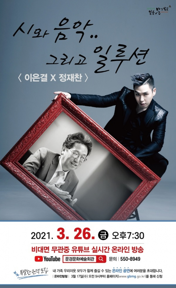 문경문화예술회관은 3월 26일(금) 오후7시 30분 일루셔니스트 이은결과 시 에세이스트 정재찬 교수의 ‘시와 음악 그리고 일루션’이란 타이틀을 가지고 관객들과 온라인 양방향 소통 공연으로 만날 예정이다.