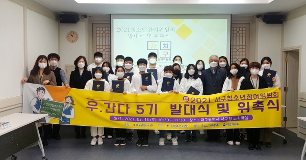 대구 서구청(구청장 류한국)은 지난 13일 구청 소회의실에서 ‘2021년 서구청소년참여위원회 우·간·다(우리가 간다) 제5기 발대식 및 위촉식을 개최했다고 밝혔다.