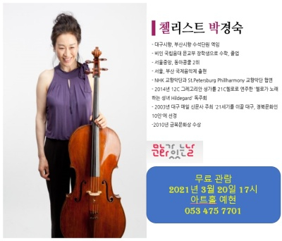 첼리스트 박경숙의 독주회는 지난 2월 남구 이천동에 개관한 복합문화공간 대구아트파크 내 아트홀 예현에서 오는 3월 20일 오후 5시에 열리며, 남구 ‘문화가 있는 날’ 프로그램으로 전석 초대로 진행된다. (☎문의 053 475 7701)