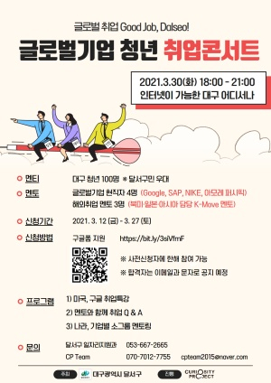 대구 달서구(구청장 이태훈)는 3월 27일까지 글로벌기업 취업을 희망하는 청년을 대상으로 『2021 글로벌기업 청년 취업콘서트』참여자를 모집한다고 밝혔다.