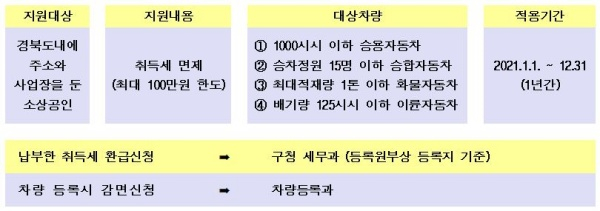취득일 현재 경상북도에 주소와 사업장을 두고 사업자등록을 한 소상공인이 생계형 자동차(배기량 1000㏄ 이하 승용자동차, 승차정원 15명 이하 승합자동차, 최대적재량 1톤 이하 화물자동차, 배기량 125㏄ 이하 이륜자동차)를 취득하는 경우 먼저 감면 신청하는 1대에 대해 취득세를 2021년 12월 31일까지 면제하되, 취득세액이 100만 원을 초과하는 경우 100만 원까지 감면받을 수 있다.