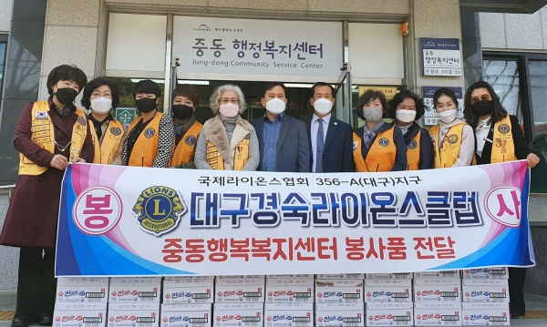 국제라이온스협회 356-A(대구)지구 경숙라이온스클럽(회장 김경희)은 지난 16일 중동행정복지센터에 방문해 어려운 이웃에게 전달해 달라며 ‘사랑의 라면’ 55박스를 기탁했다.