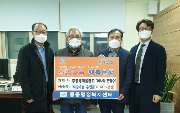 | ↑↑ 중동새마을금고는 중동행정복지센터를 방문해 위기가구 등을 위한 성금 160만 원을 전달한 후 기념촬영하고 있다.(왼쪽에서 두 번째 문명수 중동새마을금고 이사장, 세 번째 김경호 중동장) |