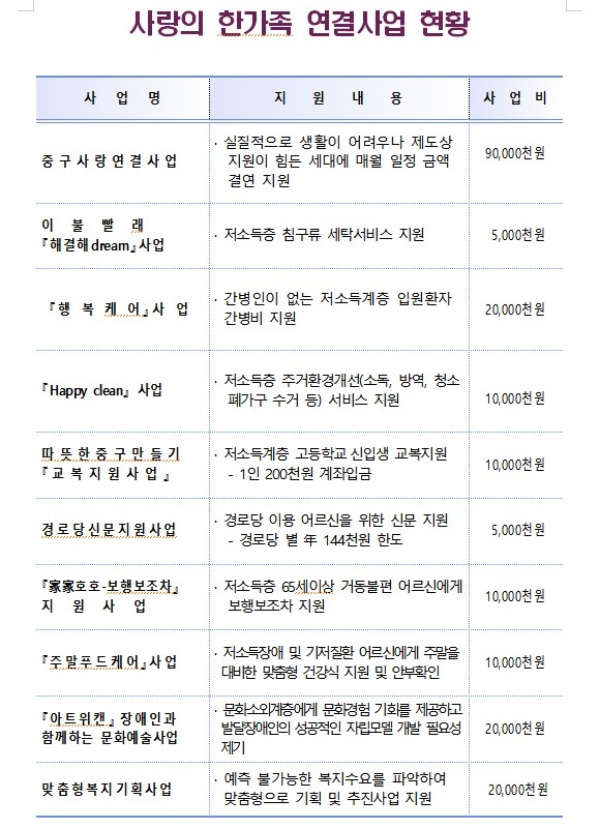 주요사업은 ▲실질적으로 생활이 어려우나 제도상 보장이 힘든 복지 사각지대에 있는 저소득층 150세대에게 월 5만 원을 지원 하는 『중구사랑연결사업』 ▲중한 질병으로 입원 및 수술 후 간병할 보호자가 없는 한부모가정, 장애인가정, 실질적 독거노인 등 저소득층 50명에게 1인 최대 40만원을 간병인 또는 간병업체에 지급하는 간병비 지원사업 『행복케어』이다