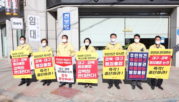 예천군의회(의장 김은수)는 3월 22일 9시 장날을 맞아 예천읍 천보당 사거리 일원에서 의원 전원이 참석한 가운데 대구·경북 행정통합 추진 중단 촉구 집회를 개최했다.