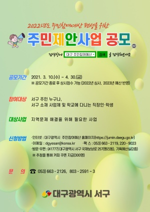 대구 서구는 3월 10일부터 4월 30일까지 2022년 예산편성을 위한 ‘주민참여예산 제안사업’을 공모한다고 밝혔다.