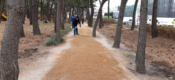 우선 송림테마거리 옆 솔내음 둘레길 중 주요산책로 1.5km의 마사토 포장을 마무리해 산책은 물론이고 맨발걷기에 좋은 곳으로 조성을 완료했으며, 소나무 뿌리와 공생하는 균근의 활력을 증진시켜 소나무가 잘 자랄 수 있도록 솔숲 내 떨어진 낙엽을 제거해주는 사업도 동시에 실시했다.