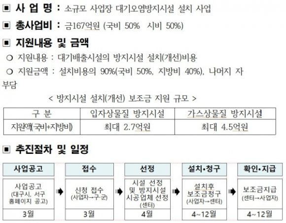그동안 대구 서구청에서는 산업단지내 대기오염물질 다량 배출사업장을 대상으로 소규모 사업장 대기오염 방지시설 설치 지원사업을 실시하여 산업단지내 노후화된 대기오염 방지시설을 사업장별 특성에 맞는 첨단의 최적방지시설을 교체 설치하도록 2019년 13개소 35억 원, 2020년 17개소 61억 원을 지원하였다.
