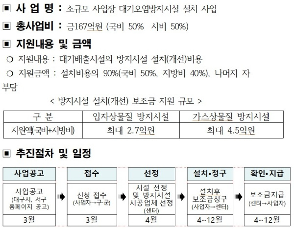 지원금액은 사업장의 노후 방지시설 교체 시, 방지시설의 종류와 용량에 따라 최대 4억5천만 원까지며, 지원받은 사업자는 3년 이상 해당 방지시설 운영하여야 하고, 방지시설 적정 가동여부 확인을 위해 사물인터넷(iot)설비를 부착해야 한다.