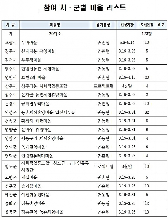 경상북도는 마을별 프로그램 추진 일정에 맞춰 3월 19일 부터 귀농형 9개 마을, 귀촌형 9개 마을, 프로젝트형 2개 마을 총 20개 마을에서 170여명의 참가자를 모집할 예정으로 신청자를 받고 있다.